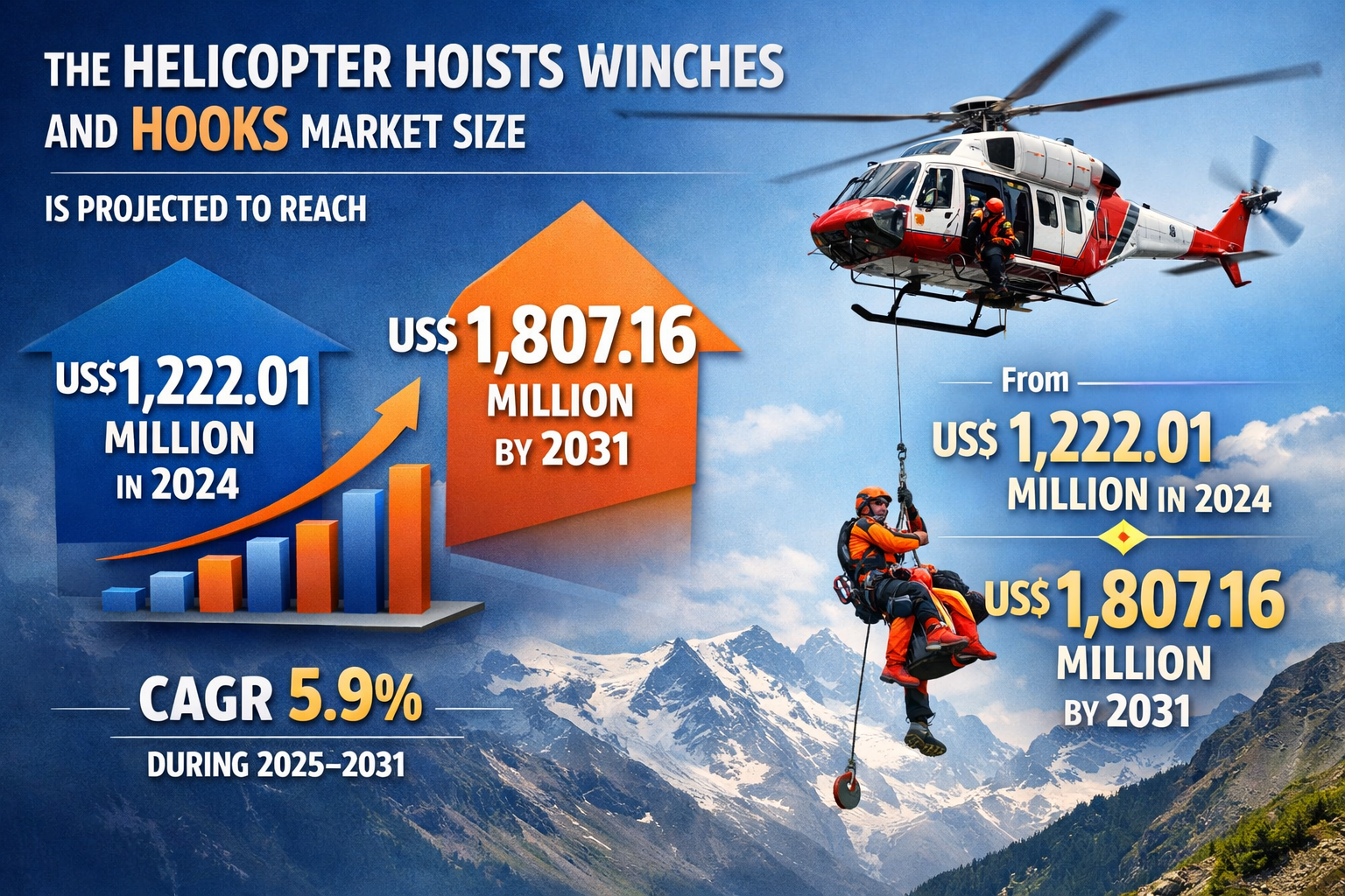 The helicopter hoists winches and hooks market size is projected to reach US$ 1,807.16 million by 2031 from US$ 1,222.01 million in 2024. The market is expected to register a CAGR of 5.9% during 2025–2031. This growth is fueled by a global push toward modernizing rotorcraft fleets and the increasing frequency of climate-related disaster relief missions. Furthermore, the expansion of the offshore wind energy sector is creating new avenues for specialized hoisting equipment, as helicopters are increasingly used for personnel and equipment transfers to remote offshore platforms.